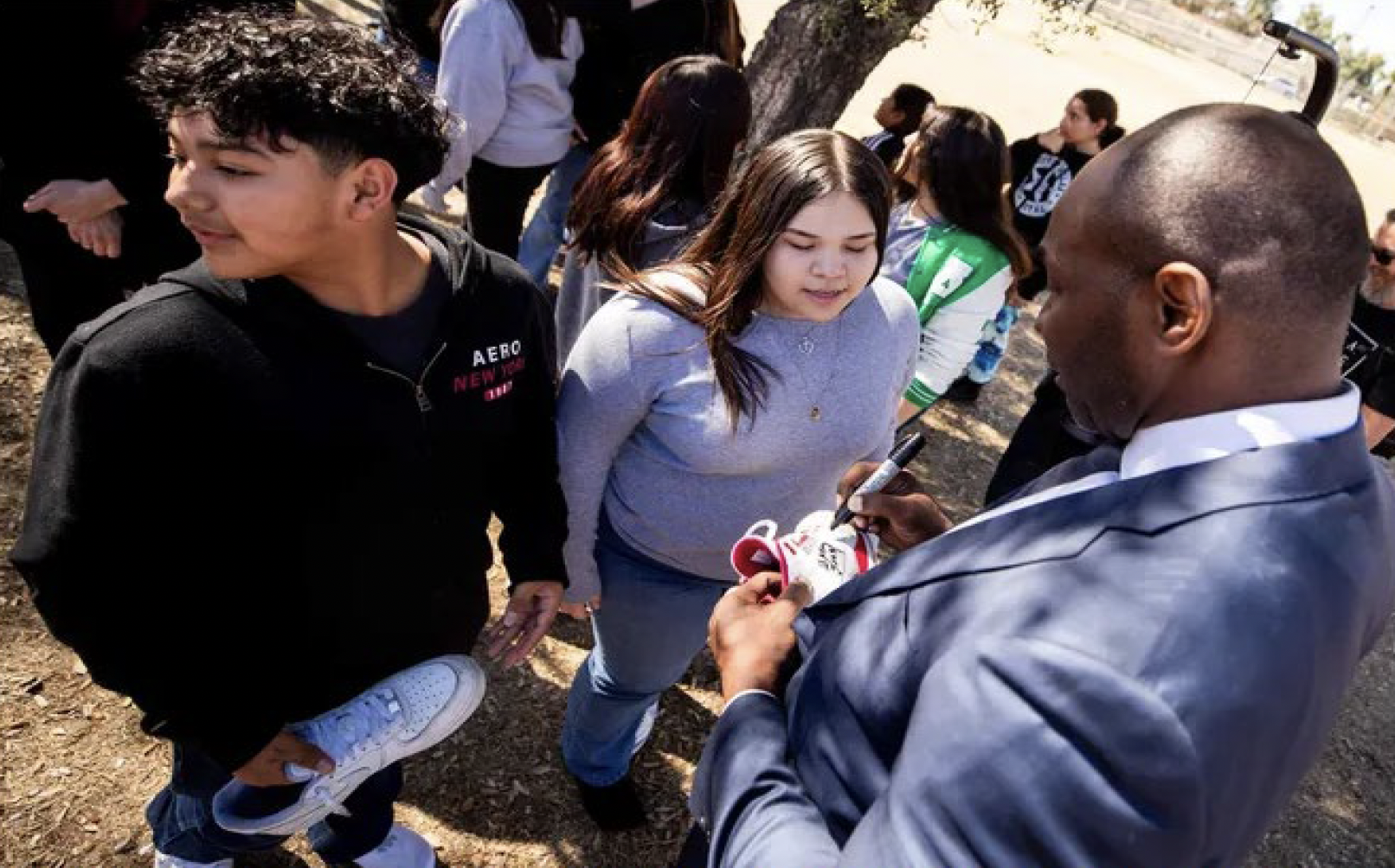Former NFL player Wesley Leasy autographs a student’s sneaker during a visit to Kenilworth School in Phoenix on Feb. 12 2024